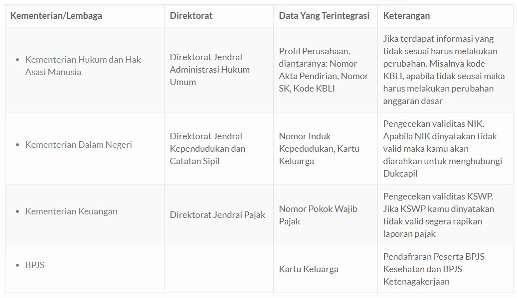 Sebagai informasi tambahan, berikut kami tampilkan tabel Kementerian/Lembaga yang terintegrasi OSS saat kamu melakukan registrasi di OSS: